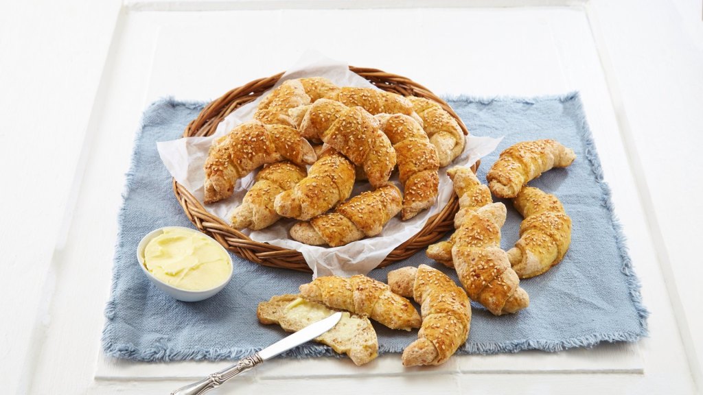 - Pensle med egg og dryss på sesamfrø før hornene stekes midt i ovnen i ca. 15 minutter. Avkjøl på rist.