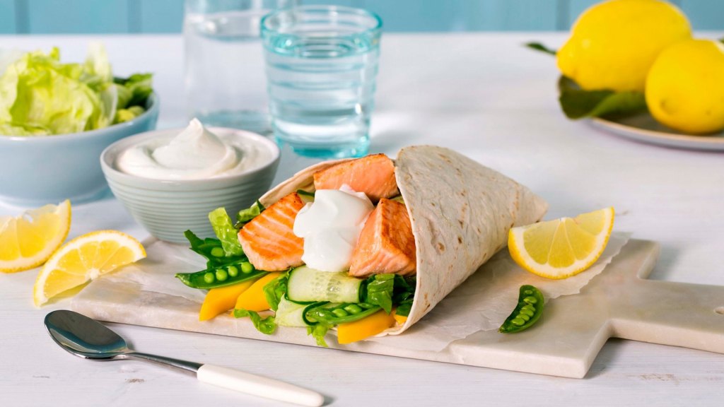 En fristende og frisk wrap fylt med stekt laks og knasende grønnsaker. Perfekt start på det nye året!