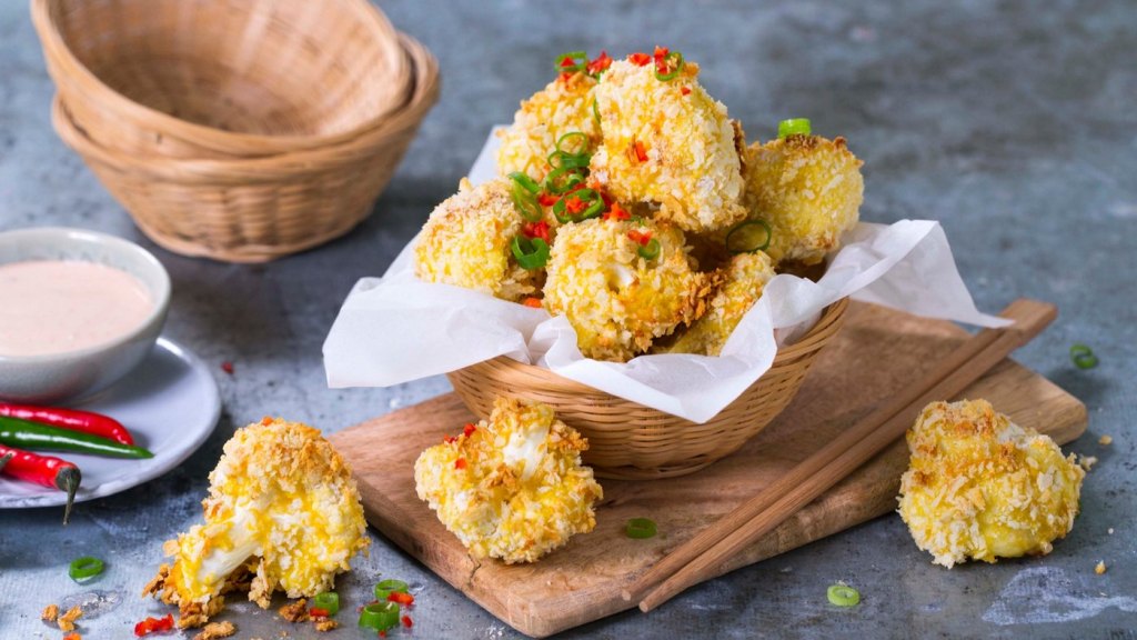 Hakk vårløk og chili og dryss over de stekte blomkålbitene og server med rømme- og srirachadipp.